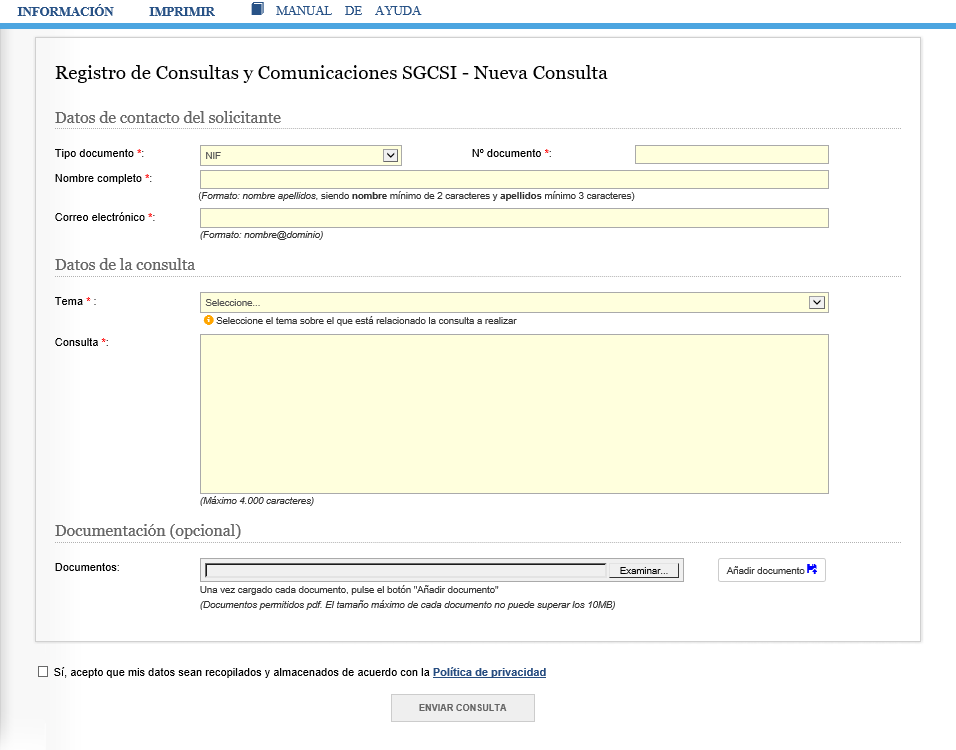Para realizar una nueva consulta hay que cumplimentar los siguientes datos: